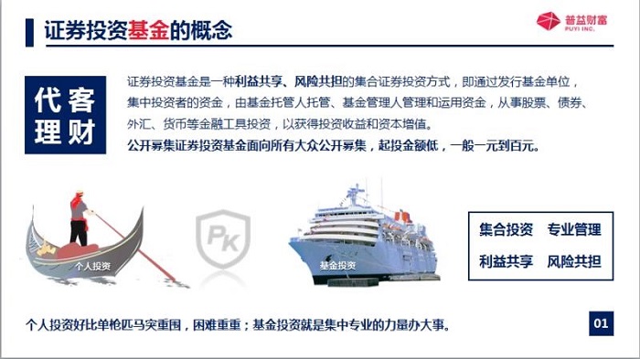 把這些資金呢投資于股票債券外匯貨幣等金融工具的一種集合投資方式,也就是說不止投資單一只股票,也不止投資單一只債券,而是投資多只股票或者多只債券的一種集合投資方式,極大地分散的風(fēng)險,因為咱們都知道雞蛋不能放在同一個籃子里面,并且呢,公募基金是面向所有大眾公開募集的,起投金額是比較低的,一元起投呀,百萬元起投呀,千元起投。這對于很多投資者來說呢,都是可以接觸的到的,那如果說拿個人投資跟基金投資進(jìn)行比較的話,就像在海里面航行一樣,個人投資就像一個孤身備戰(zhàn)的小姑船一樣,那基金投資,因為它背后有一整個團(tuán)隊進(jìn)行運作,那他的專業(yè)非常強(qiáng),所以呢,它就是集中專業(yè)的力量辦大事。