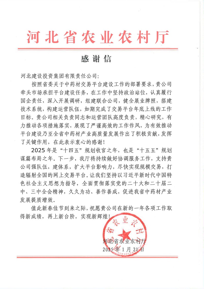 近日,河北省農業(yè)農村廳向河北建投集團發(fā)來感謝信,高度贊揚河北建投集團在河北省中藥材交易平臺建設工作中所展現(xiàn)出的責任擔當與卓越貢獻。