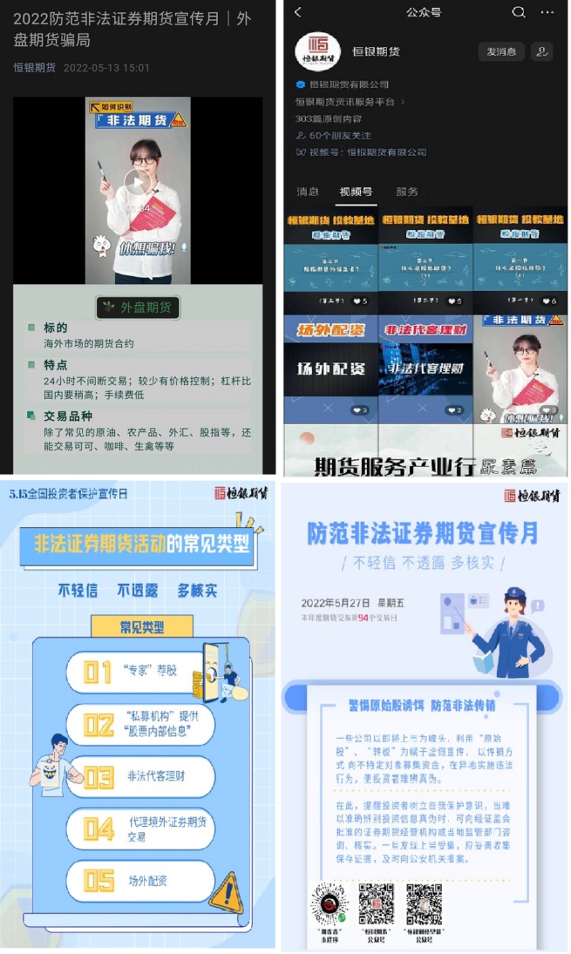 線下活動進行的同時,恒銀期貨公眾號、視頻號也在推進反詐防非的內容宣傳,通過圖文講解、短視頻、宣傳海報等多種方式傳播知識,增強投資者反詐意識。