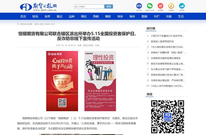 2022年5月15日,恒銀期貨以“5.15全國投資者保護宣傳日”為契機,聯(lián)合石家莊市維明派出所、東風路派出所,開展以“心系投資者,攜手共行動——筑牢注冊制改革基礎,保護投資者合法權益”為主題的非法證券期貨宣傳進社區(qū)活動。走進金鼎小區(qū)和東風小區(qū),對過往居民進行了非法證券期貨宣傳,同時對5.15投資者保護宣傳日進行普及。